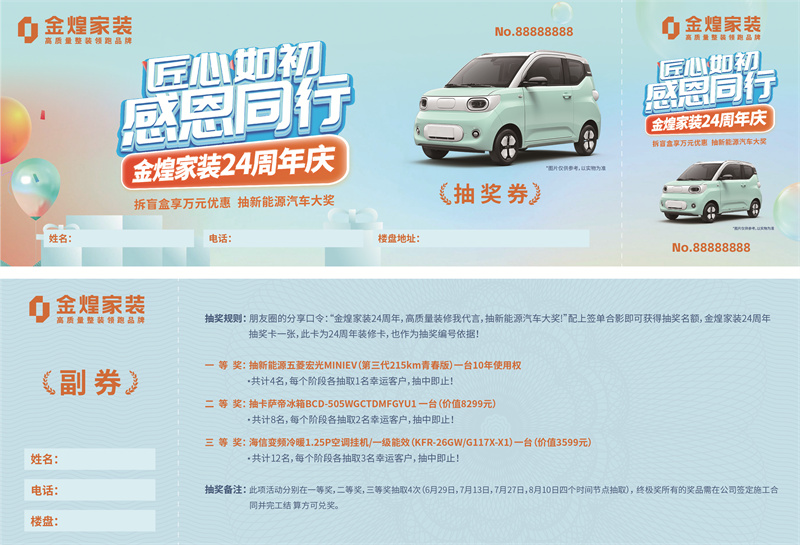 貫穿始終的“老帶新抽盲盒”活動,以現(xiàn)金與材料減免的雙重驚喜搭建情誼橋梁;新能源汽車大獎持續(xù)引爆參與熱情。廿四載春秋,金煌裝飾以毫厘精工雕琢安居夢想,用赤子之心回報社會信任。這場跨越兩個月的溫情之旅,正成為見證城市變遷、傳遞民生溫度的生動實踐。