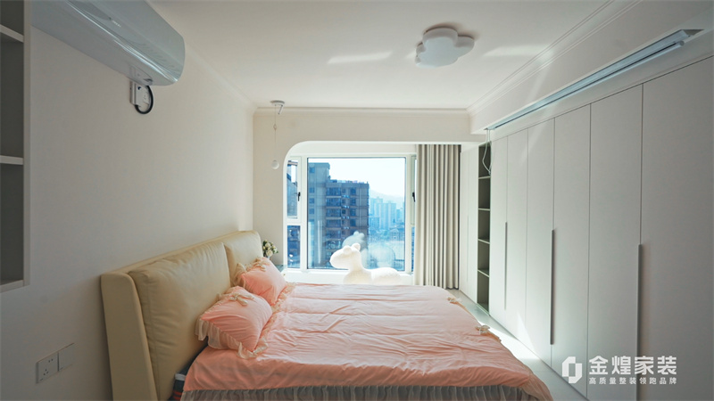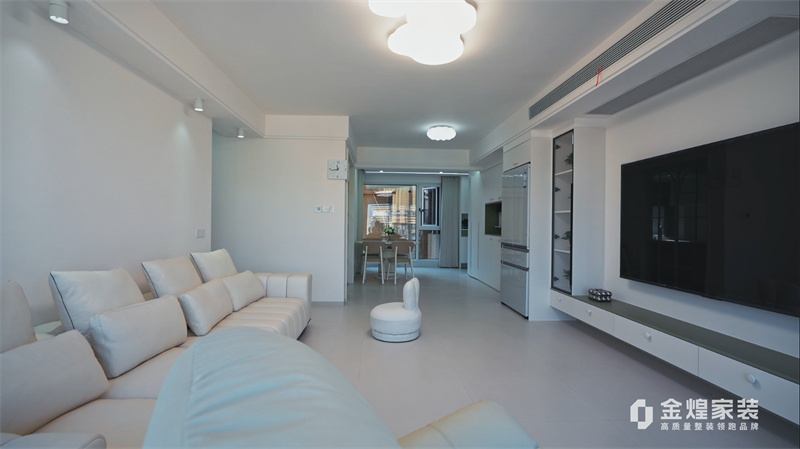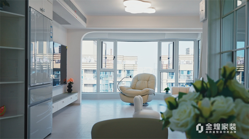 客廳內(nèi),大電視直接掛在墻上,下方配以簡約的電視柜,旁邊擺放著舒適的沙發(fā)和別致的休閑椅,沒有過多的繁雜裝飾,顯得寬敞又明亮。大窗戶的設(shè)計讓室內(nèi)光線充足,進一步增強了空間的通透感。