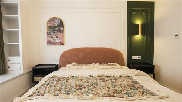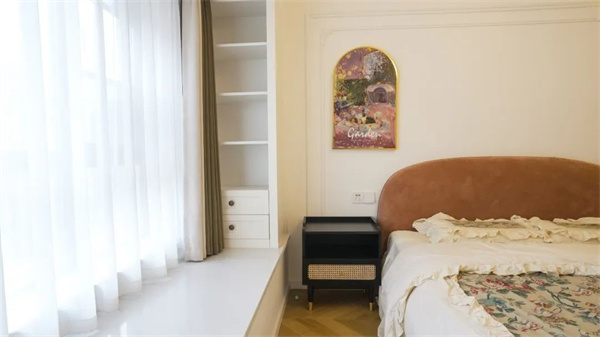 主臥延續了整體的色系搭配法則,大面積奶油色調讓整個空間看起來復古又慵懶。背景墻搭配了款式簡約的石膏線條,恰到好處地增添了精致感。床頭搭配一組精致的定制柜形如小鋼琴,輕盈靈動,靜置角落裝點臥室,每一處細節都充滿法式的浪漫與優雅。