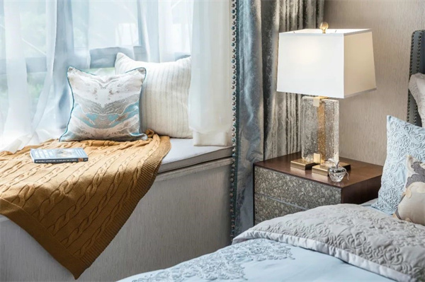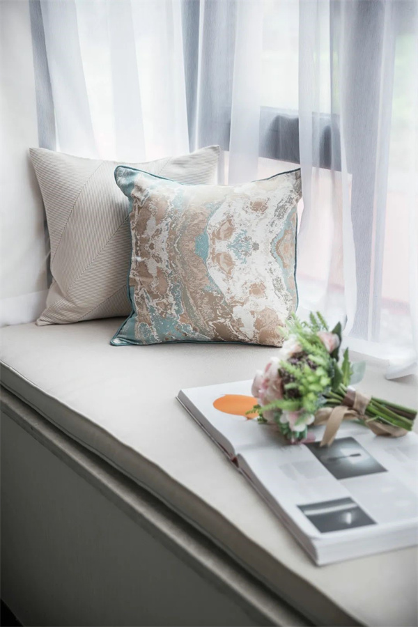 次臥以柔和的淺灰色和象牙白為主色調(diào)。床上鋪設(shè)著柔軟的棉麻床品,搭配著幾只絲綢抱枕,帶來舒適而奢華的觸感。大窗戶配有輕紗窗簾和厚重的絨布窗簾,既能保證充足的光線,又能在需要時提供私密性。