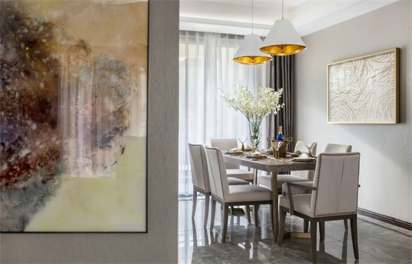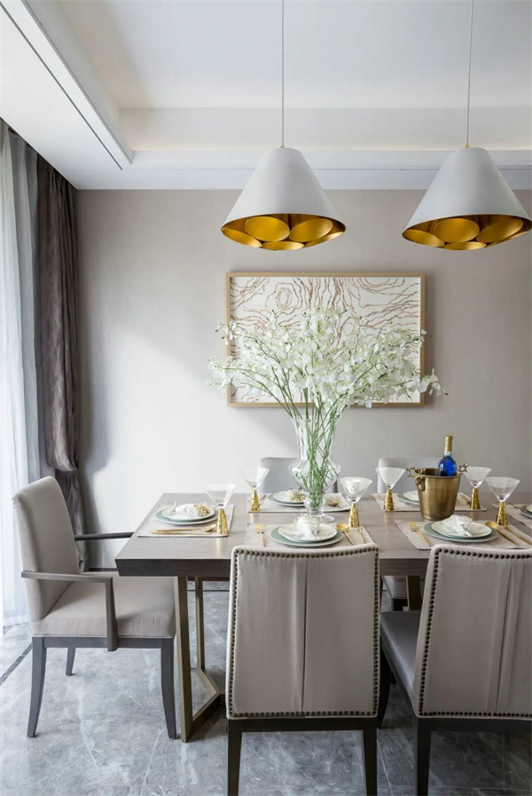 餐廳以淺色為主調(diào),中央擺放著一張長方形仿木質(zhì)紋理的餐桌,桌面光滑細(xì)膩,散發(fā)出低調(diào)的奢華感。上方懸掛著一盞華麗的水晶吊燈,搭配桌上精心布置的金色餐具、細(xì)瓷餐盤以及充滿自然氣息的鮮花,營造出溫馨而浪漫的用餐氛圍。