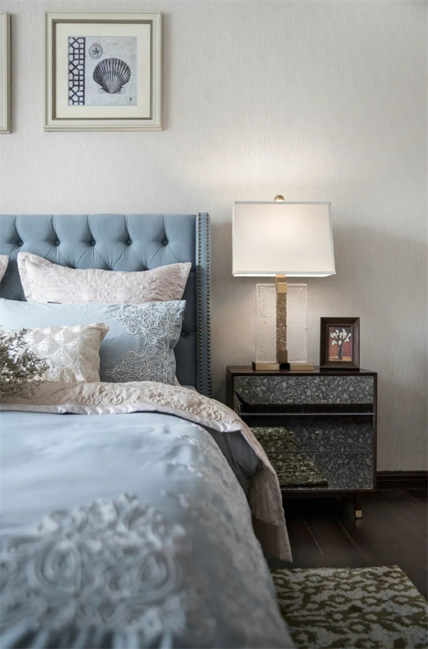 主臥中,優(yōu)雅與奢華交織成了一幅夢幻的畫卷。房間的主色調(diào)為柔和的米白色和天藍(lán)色,床頭采用軟包設(shè)計,床上鋪設(shè)著絲綢質(zhì)地的天藍(lán)色床品,柔軟而光滑的觸感讓人沉醉其中,與花卉相互輝映,彰顯出典雅與細(xì)膩。