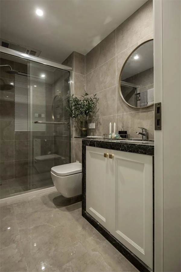 衛生間以淺色大理石瓷磚裝飾,金屬邊框的鏡面與精致的洗漱臺相映成趣,在燈光的映襯下透出高級感。玻璃淋浴隔斷,讓空間更顯通透,打造出一個舒適放松的洗浴空間。