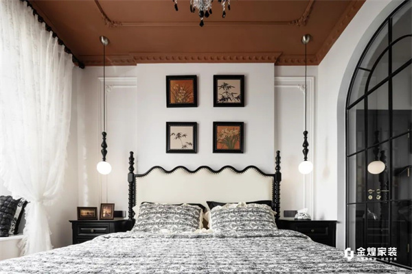 主臥延續了整體的色系搭配法則,大面積巧克力色墻頂搭配精致的空中吊燈,讓整個空間看起來復古又慵懶。背景墻采用款式簡約的石膏線條,恰到好處地增添了精致感。精致的軟裝布置,讓每個角落都融入高貴與溫暖,仿佛置身于巴黎的浪漫宮廷。