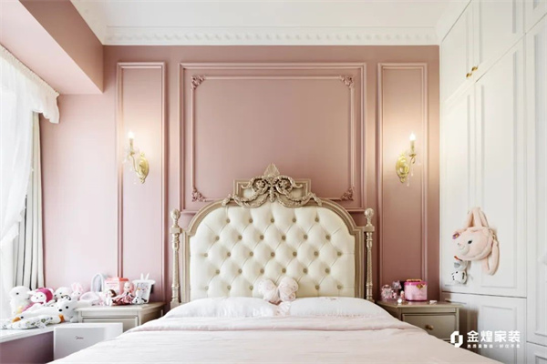 粉色成為兒童房的主調。精致的法式線條,細膩的雕花與粉色背景相得益彰。公主床的弧形設計與細膩的雕飾讓房間充滿了浪漫的童話氣息。柔和的光線透過窗簾灑入,整個空間仿佛是一個溫暖、充滿想象力的粉色世界,既優雅又充滿童趣。