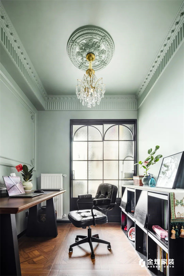 書房在法式復古風格的演繹下,散發出濃厚的文化氣息與藝術氛圍。深色實木書桌搭配精美的書架,呈現出穩重而優雅的格調。而復古的落地窗設計則賦予空間一份私密與寧靜,讓人沉浸在書香與復古的藝術氛圍中,每一個細節都充滿了高雅的品味。