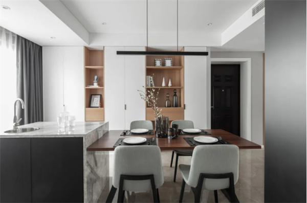 廚房采用現(xiàn)代設(shè)計(jì)的黑白灰配色方案,櫥柜選用原木色柜面和白色臺(tái)面組合,搭配嵌入式電器,創(chuàng)造出極簡(jiǎn)的外觀。同時(shí),大理石紋路的地板與墻面,也為廚房增添了質(zhì)感。