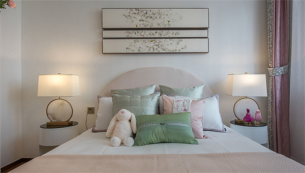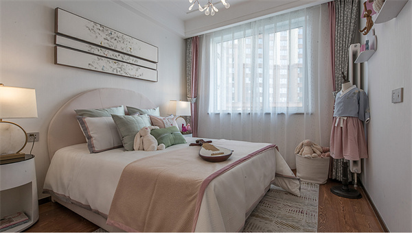 兒童房的裝修以粉色為主色調(diào),搭配暖白底色,整體呈現(xiàn)出溫婉秀氣、靈動(dòng)靜雅的氛圍。床的背板上方掛著中式水墨畫的簡(jiǎn)約裝飾,透露著青春的氣息,為空間注入了生機(jī)勃勃的活力。