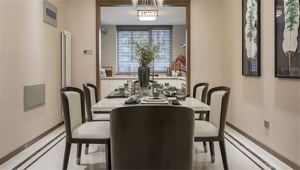 餐廳的位置緊鄰著廚房,這樣可以方便地將美食直接送到賓客的餐桌上。以棕色原木餐椅搭配綠植和水墨掛畫來裝點(diǎn)空間,營(yíng)造出一種溫馨舒適的氛圍,讓主人能夠在此款待來賓,享受美食和美好時(shí)光。