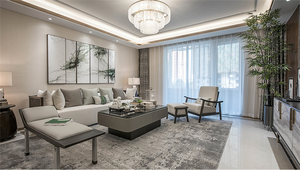 客廳中,新中式風(fēng)格融合傳統(tǒng)文化和現(xiàn)代設(shè)計(jì),巧妙地將兩者相結(jié)合。經(jīng)典的木質(zhì)家具搭配現(xiàn)代簡(jiǎn)約的沙發(fā),打破了傳統(tǒng)與現(xiàn)代的界限。大面積的落地窗將自然光線引入,讓整個(gè)空間更加通透明亮。