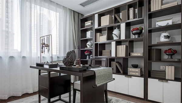 書房呈現(xiàn)出新中式的獨(dú)特風(fēng)采,整體設(shè)計(jì)注重空間的布局和家具的選材。沉穩(wěn)的木質(zhì)書桌與原木書柜展示了東方文化的深厚底蘊(yùn)。書桌上的文房四寶、書柜上的古典書畫和瓷器既點(diǎn)綴了空間,又表達(dá)了主人對(duì)傳統(tǒng)文化的熱愛。