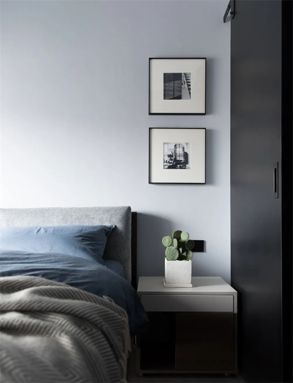 主臥室延續了整體的極簡風格,以淺灰色和白色的搭配為主,消除了多余的裝飾元素。深色的定制柜和藍灰色的床品為臥室注入了寧靜的舒適感。通過精心設計的照明,臥室的空間質感和氛圍得以突顯,使簡潔的設計與窗外的自然景色相得益彰。