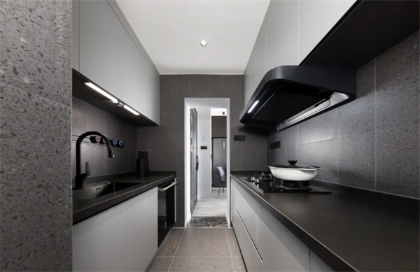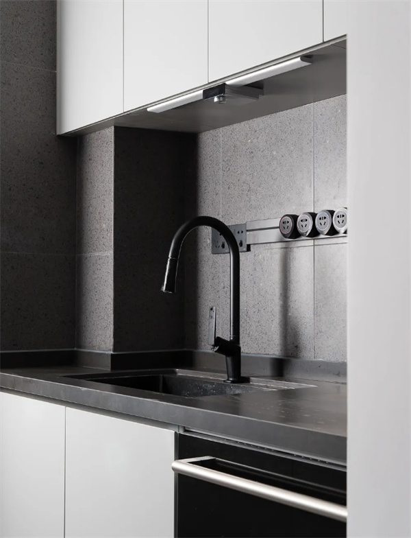 廚房是一個完美的結合了功能性和美學的空間。清潔的線條和簡約的設計元素在這里主導,灰色的定制櫥柜提供了充足的儲存空間,同時保持了整個空間的干凈度。智能燈光和智能廚房電器的使用,提高了生活的便利性,為業主打造一個理想的烹飪空間。
