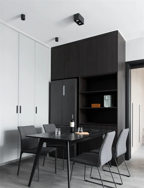 餐廳延續了整體的簡約優雅設計風格,以黑色大理石臺面的餐桌為中心,配以灰色布藝餐椅。旁邊的餐邊柜和嵌入式冰箱完美融合,使整個空間顯得清新、簡約和寬敞舒適。