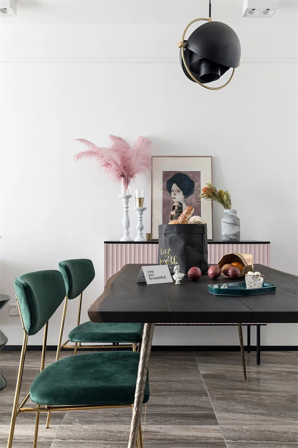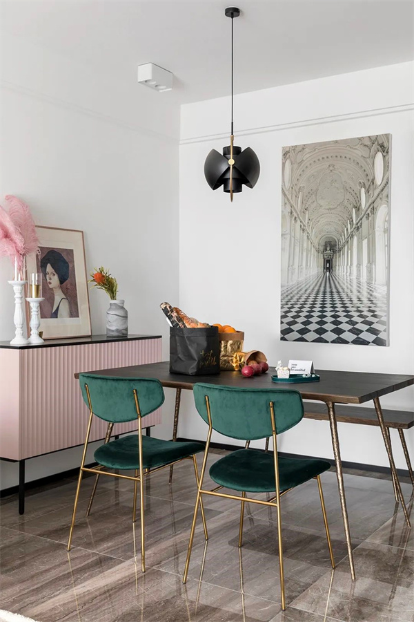 餐廳以深色木質餐桌搭配綠色絨面椅子,既現代又不失溫暖。金色的椅腿與黑色吊燈相呼應,增添了幾分奢華感。墻上的藝術畫作為整個空間注入的藝術氛圍,柔和的光線和精心布置的細節,讓每一次用餐都成為一種享受。