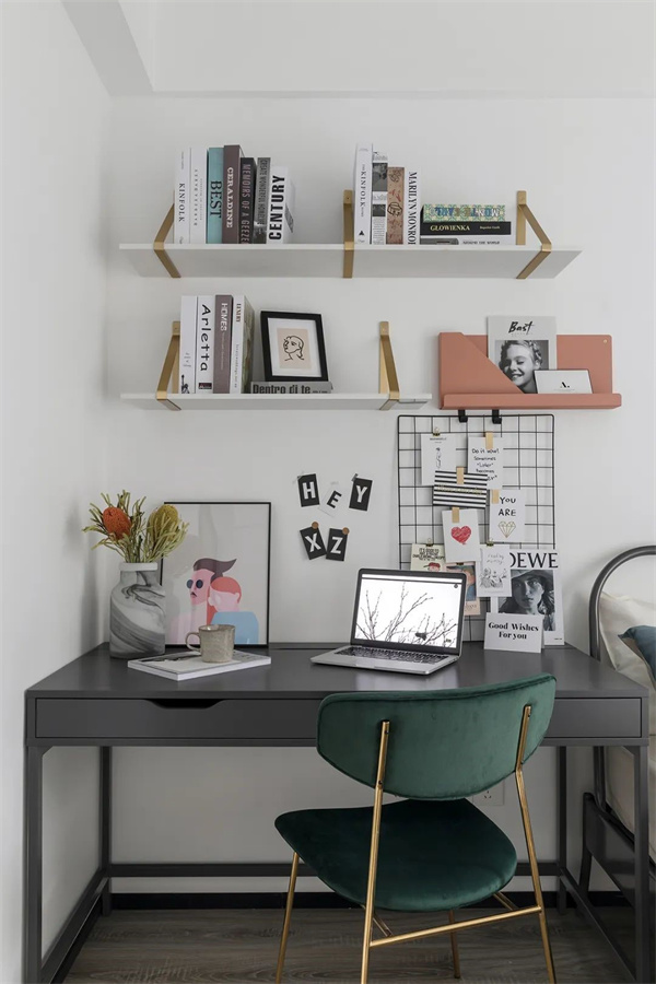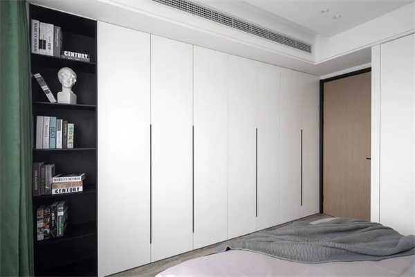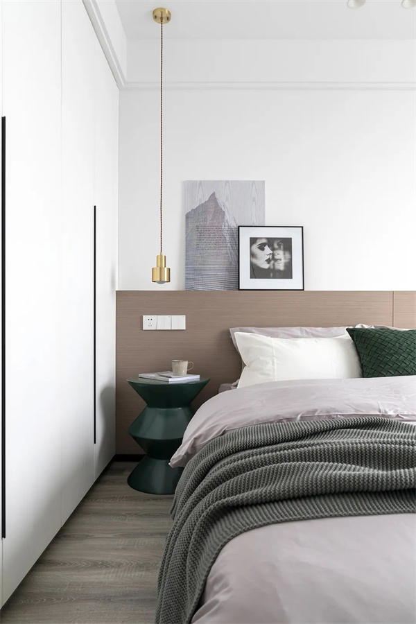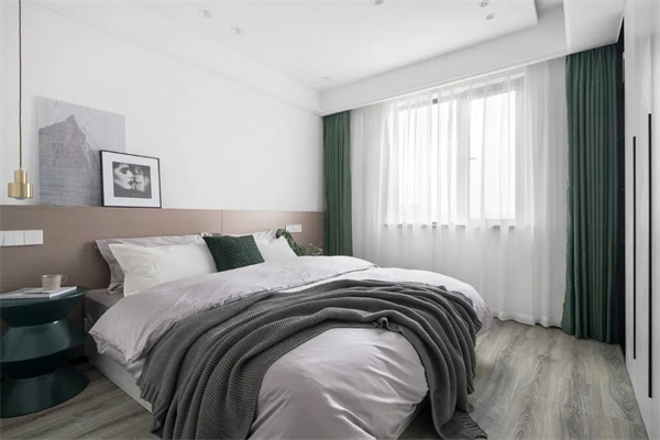 主臥仿佛寧靜而舒適的避風港。床頭的木質背景墻搭配簡約的裝飾畫,既現代又不失自然氣息。綠色的窗簾和灰色的毛毯為整個空間增添了幾分清新與溫馨,精心布置的細節和柔和的色調,營造出一種溫暖而放松的氛圍。