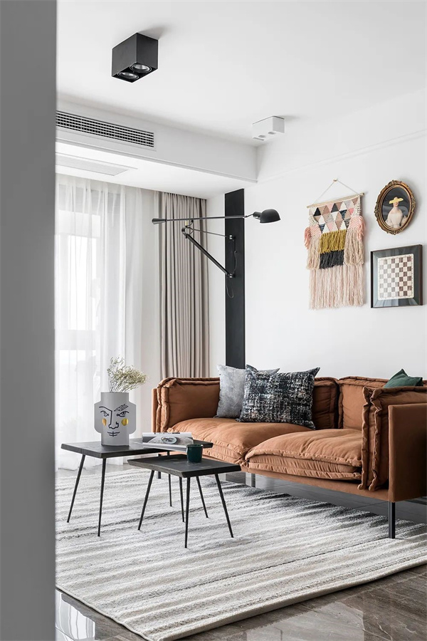 客廳中,棕色的沙發搭配簡約的茶幾和椅子,既實用又不失設計感。墻上的裝飾畫和手工編織掛毯為整個空間增添了幾分藝術氣息,而綠植則帶來了自然的清新感。無論是閱讀一本書,還是與家人朋友共度時光,這里都是理想的放松之所。