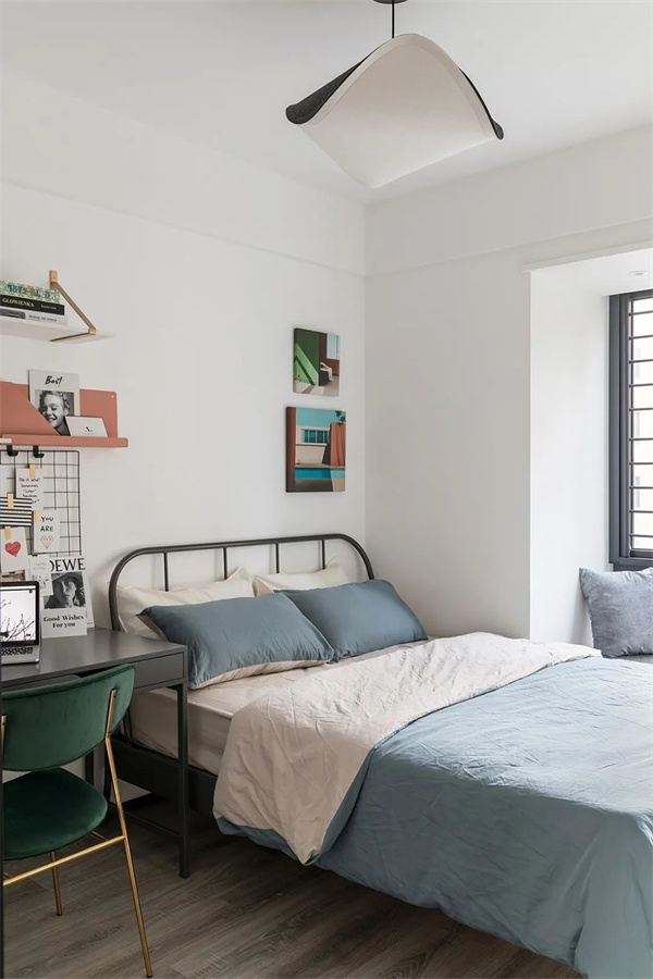 次臥延續北歐風格的簡約設計,以淡雅的藍色為主,簡潔的家具搭配柔軟的床品,為房間增加了溫馨感。窗戶保持通透,利用自然光線,讓整個房間更具層次感。