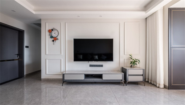 客廳灰色地磚與簡(jiǎn)潔墻面空間結(jié)合,搭配灰色皮藝沙發(fā),而電視墻則是以白色飾面板為背景,壁掛上電視機(jī),呈現(xiàn)出簡(jiǎn)潔大方的格局。陽(yáng)臺(tái)上色彩明亮的窗簾搭配暖色布藝沙發(fā),帶來(lái)的是簡(jiǎn)約的優(yōu)雅空間感,縱享愜意時(shí)光。