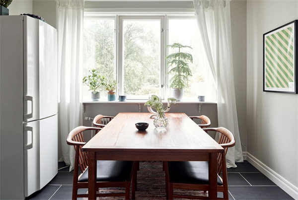 一張原木長桌,帶著自然的木紋肌理,成為家人圍坐的中心。燈光設計簡潔而柔和,打造出寧靜而舒適的用餐氛圍。設計上不追求繁復,卻處處藏著生活的溫度。在這里,每一頓飯,都是與自然、與家人的美好對話。