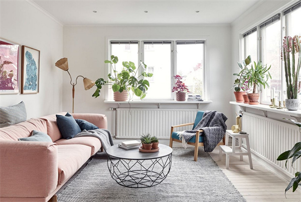客廳白色的墻面與自然木色的家具相映襯,打造出明亮寬敞的空間。一組粉色布藝沙發與柔軟的地毯搭配,營造出舒適宜人的氛圍。