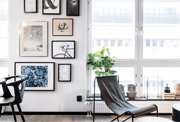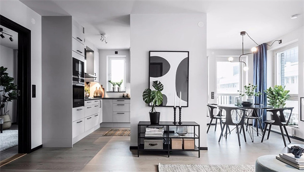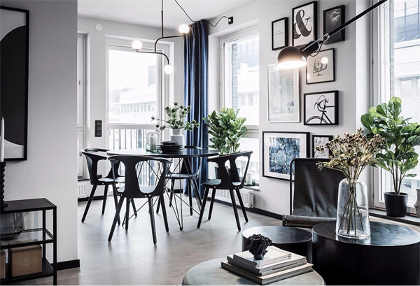 餐廳完美延續客廳的整體基調。深色圓桌和餐椅的設計,加上豐富的綠植點綴為用餐體驗增色不少。墻壁上的裝飾畫營造出藝術氛圍,使之成為家人和朋友歡聚美好時光的絕佳場所。