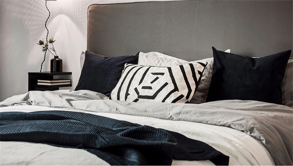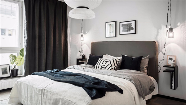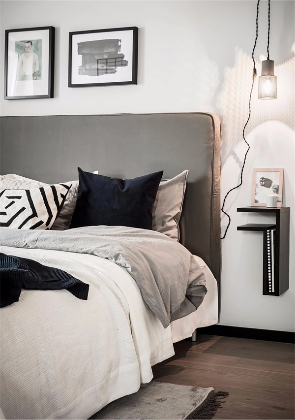 主臥的設計以中性色調為主,家具和床品的選擇呈現出極致的舒適感。軟裝上選用精致的布藝床和純凈的白色床品相搭配,以灰色地毯覆蓋地面,同時,床頭背景墻的精心設計吸引了視線,為臥室增添舒適和優雅的氛圍。