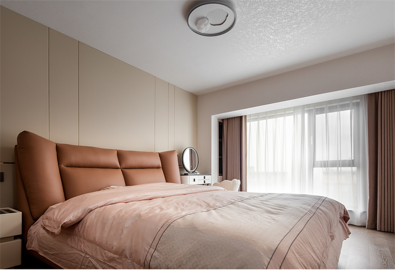 主臥采用柔和的色調與高品質的材質完美融合,營造出奢華而不失溫馨的氛圍。棕色皮質床頭板搭配細膩的床上用品,散發出濃郁的輕奢氣息。大面積的窗戶設計讓自然光線充分灑入室內,帶來明亮而舒適的視覺享受。