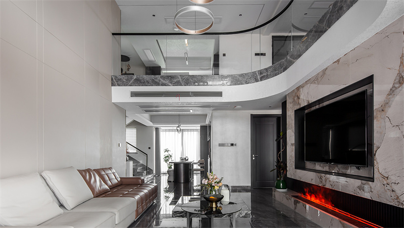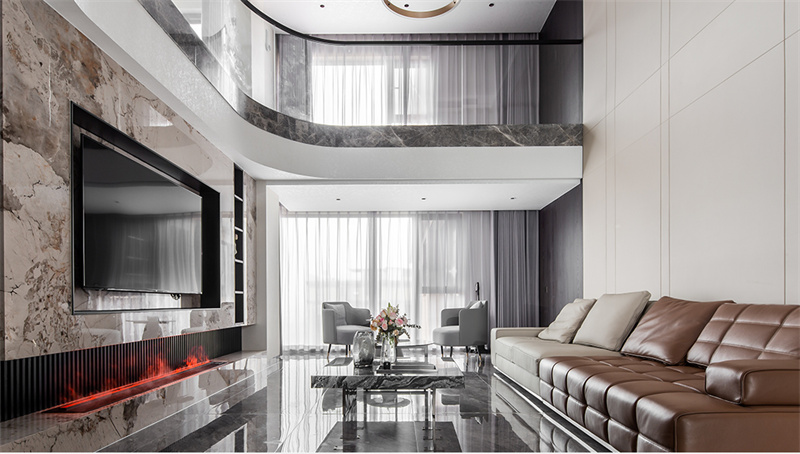 客廳以奢華和舒適為特點,注重細節和藝術品味。大理石地板和墻壁飾面營造出高貴的氛圍,精心挑選的藝術品、裝飾畫,甚至是擺放在墻角的綠植,都彰顯了主人對生活品質的追求和品味的獨特表達。