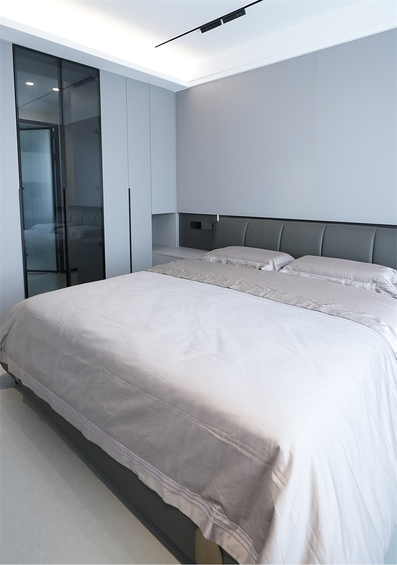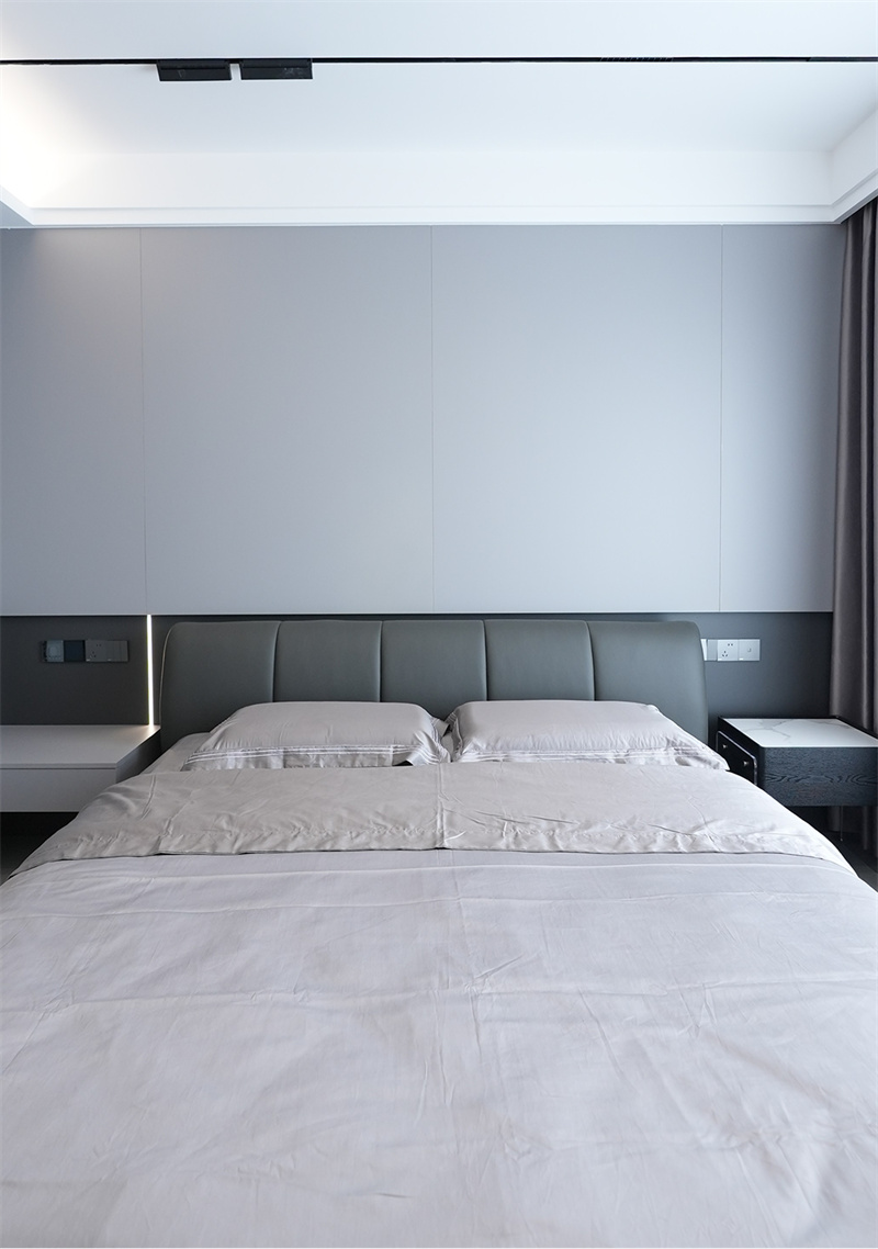 主臥選用灰色系地板,搭配上深色的皮藝床和床品,還有一體定制化的衣柜,整個空間簡潔舒適。輕松大方的床頭背景墻的飾面材料,搭配低溫暖調燈光,烘托出精致的私密氛圍,呈現克制、舒適的空間美學。