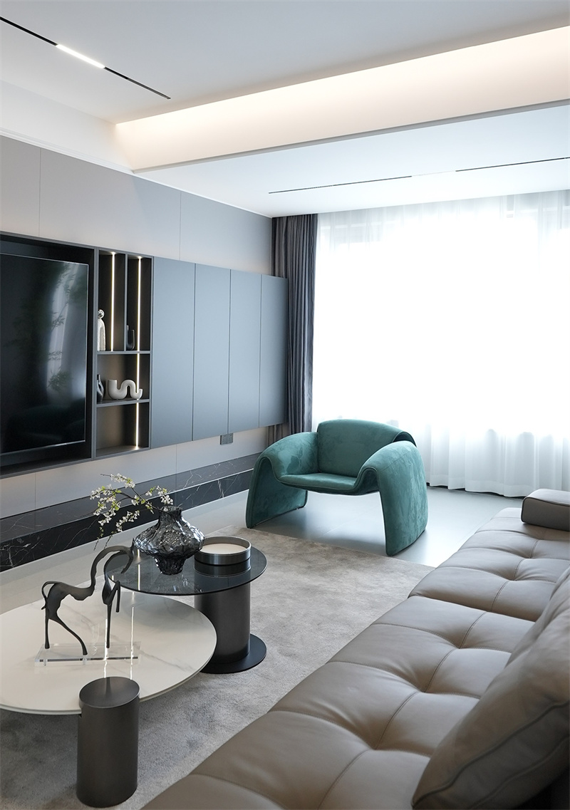 客廳以極簡的設計,加上高級灰的配色,呈現出現代舒適與愜意寬敞的氛圍。墻面采用水泥灰質感的設計,擺上一張棕色皮藝沙發,加上一張巖板茶幾,高級黑的電視墻一側設計有壁掛式書架,提供了靈活的收納,整個空間顯得極簡低調而高級大氣。