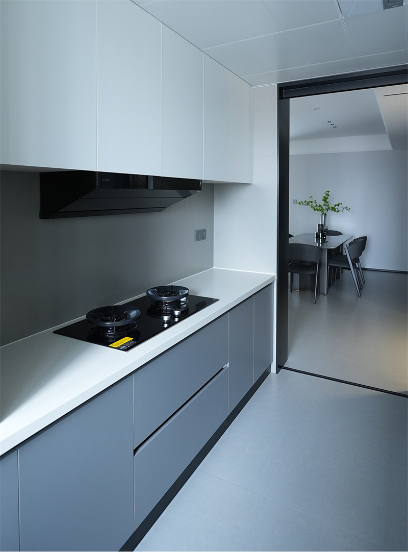 廚房設計成L形的操作動線。灰白色的地面磚,加上同色系的一體化定制櫥柜讓,廚房顯得格外的時尚雅致。全套定制與嵌入式廚電設計,更讓做烹飪空間也顯得整潔而方便實用。