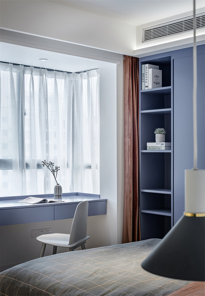 兒童房采用粉色+白色組合做主導色調。房間一角設計了L型書桌和椅子,既節省空間又功能齊全,為孩子提供了理想的作業和學習區域。書桌上擺放著裝飾品和書籍,體現了主人對細節的關注與品味的追求。