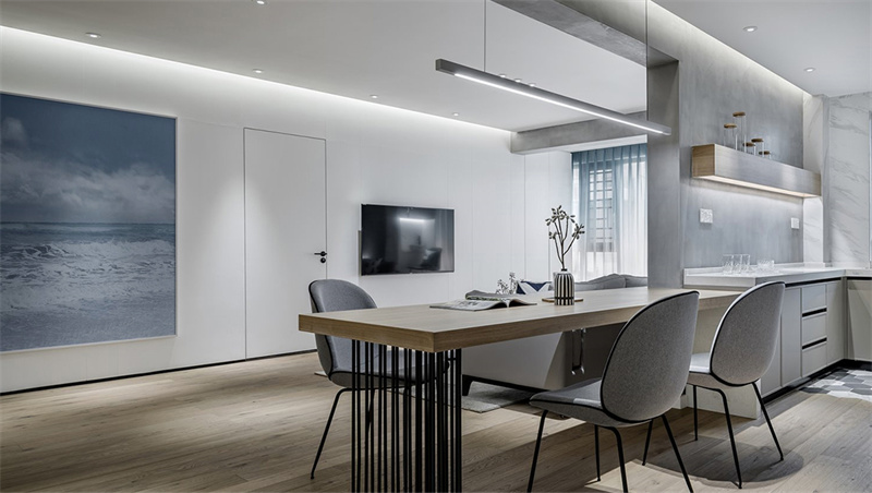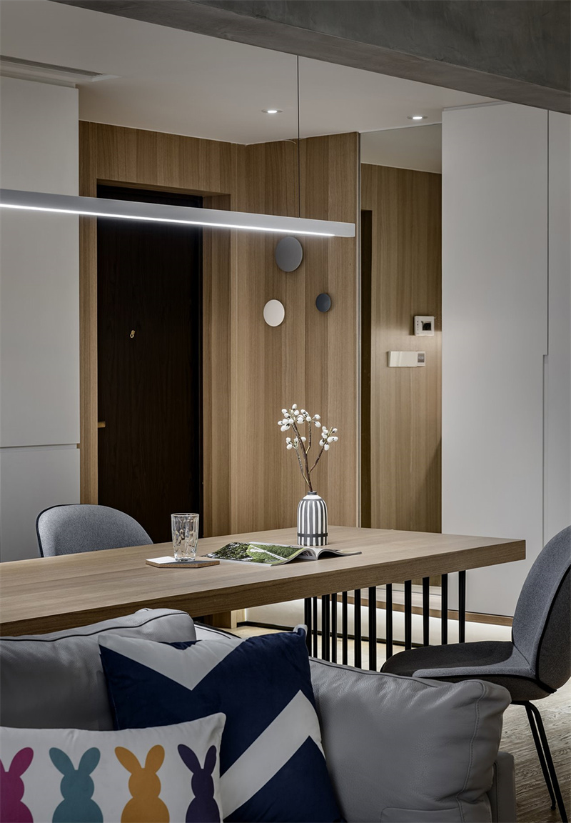 餐廳簡潔的線條與溫暖的木質元素完美融合,營造出一種舒適而溫馨的用餐氛圍。長方形的木質餐桌搭配灰色軟墊椅子,背景墻采用大面積的木紋裝飾,不僅提升了空間的層次感,還帶來了一種自然的溫暖感。