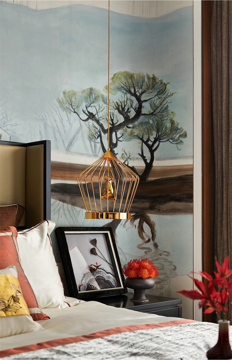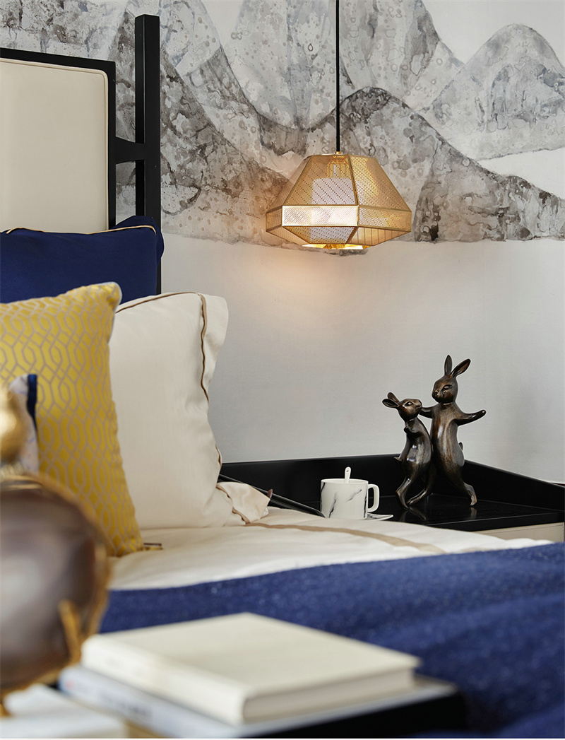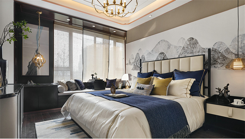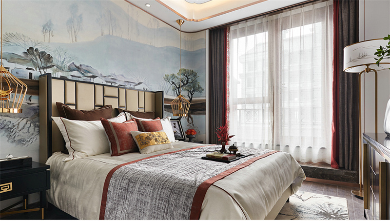 傳統(tǒng)的中式元素與現(xiàn)代的簡約設(shè)計完美結(jié)合,呈現(xiàn)出典雅與舒適的休憩氛圍。床頭背景繪制著一幅大型水墨畫,畫中山水交融充滿了詩意,為整個房間增添了一份藝術(shù)氣息。