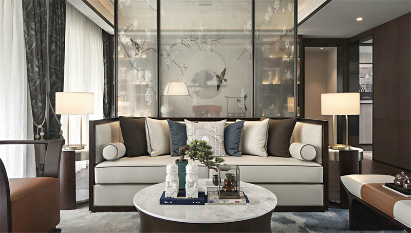 沙發墻在硬包基礎上加入詩意背景畫面,搭配新中式的沙發,側邊配上坐椅、盆栽綠植的布置,使得整個客廳充滿著儒雅端莊的氛圍氣息。