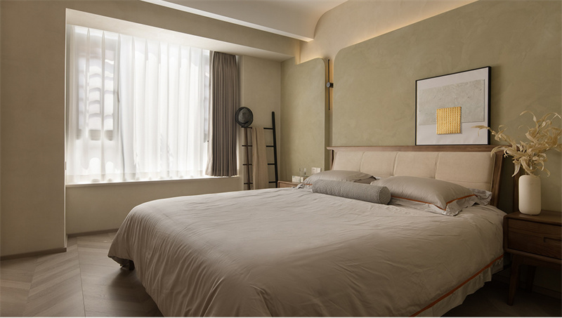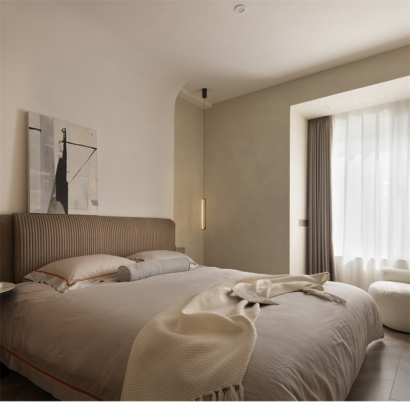 主臥延續著自然舒適的設計語言,流暢的弧形線條從天花延伸至墻面,在光影交錯中勾勒出富有層次的空間韻律。素雅的亞麻床品搭配蓬松的羽絨靠枕,其細膩的紋理在陽光下泛著柔和光澤,營造出慵懶而愜意的休憩氛圍,讓人不自覺地沉浸在這方靜謐天地之中。