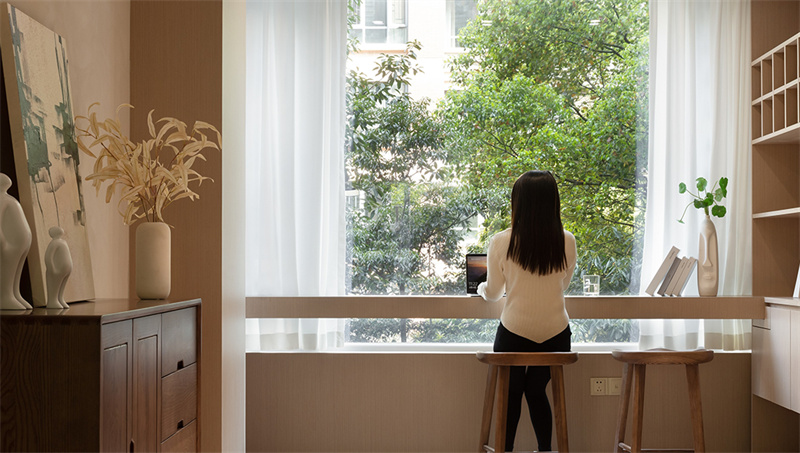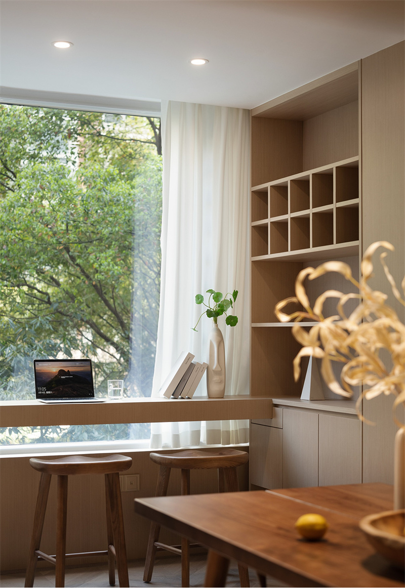 陽臺被巧妙地納入客廳空間,臨窗一側打造出兼具功能與美學的閱讀角落。定制原木書柜與懸浮式書桌相連,簡潔利落,為思考與創作留出充裕空間。一株綠植在案頭舒展著纖細的枝丫,陽光透過紗簾灑落,在紙墨書香間勾勒出靜謐的東方意境。