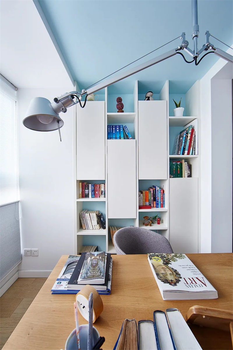 書房視野開闊,白色墻面柜體搭配原木家具、地板,顯得格外的自然協調,書桌與書柜一體化,擴大了收藏空間。桌面上擺放著書籍、文具和一些小物件,既實用又美觀,讓整個空間充滿了生活氣息。