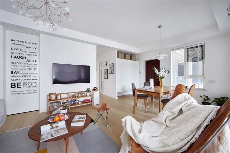 本案以北歐風格為基調,大量白色和原木色的運用,灰色的沙發,溫潤的木質元素,在良好的采光下,很好的提升了整體的色度,打造出一個既現代又充滿生活氣息的理想居住空間。