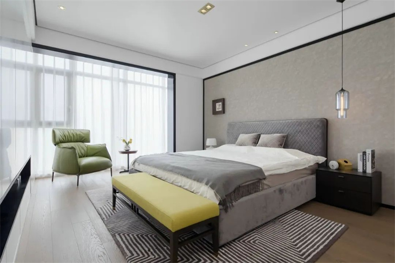 次臥以灰白為主調,搭配軟包床頭與木質地板,營造出安靜舒適的休憩氛圍。大窗采光充足,空間通透明亮。床尾亮色長凳與綠意單人椅點綴其中,為空間注入活力,整體設計簡潔實用,不喧嘩卻有溫度。