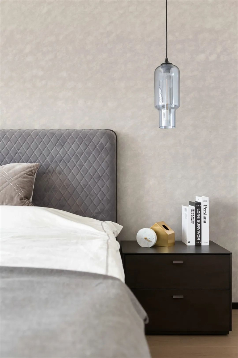 主臥以簡潔線條和低飽和色調,營造出寧靜舒適的睡眠氛圍。落地窗引入充足采光,視野開闊,連接室內外的寧靜時光。一側設置小型工作角,書桌搭配亮色單人椅,兼顧實用與設計感。床頭壁燈、香薰與裝飾擺件點綴其間,細節中透露著生活溫度。