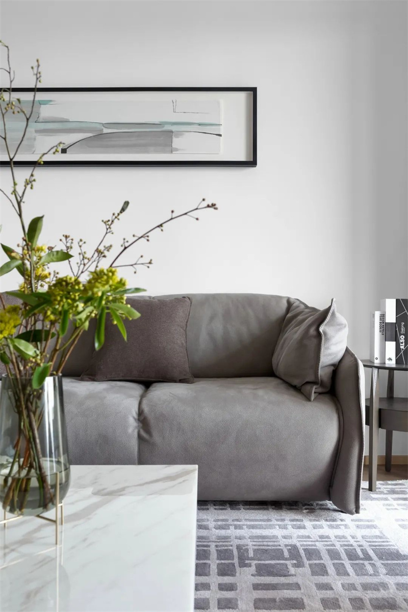 客廳以白、灰為主色調,搭配木質地板和黑色金屬線條,整體簡潔明快,充滿現代感。灰色布藝沙發與大理石茶幾組合,舒適又不失質感,搭配幾何圖案地毯,提升空間層次。這里沒有繁復裝飾,卻處處體現功能與美學的平衡。