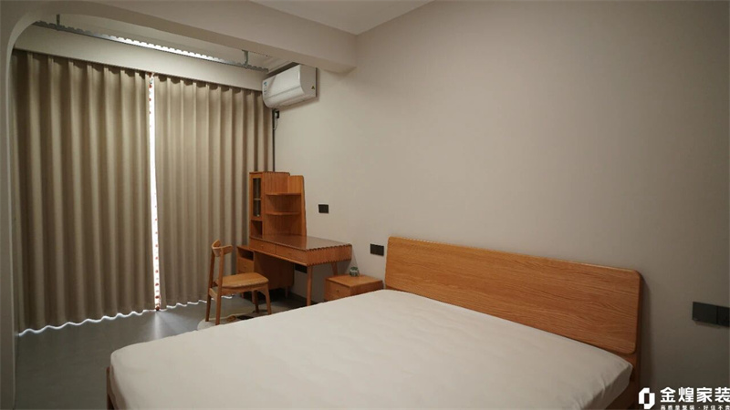 次臥更注重實用與自然質感。采用整套原木色家具,搭配柔和的燈光設計,讓整個空間顯得舒適宜人。書桌的設計簡潔大方,同時配有多功能儲物柜,既節省空間,又增加了實用性。