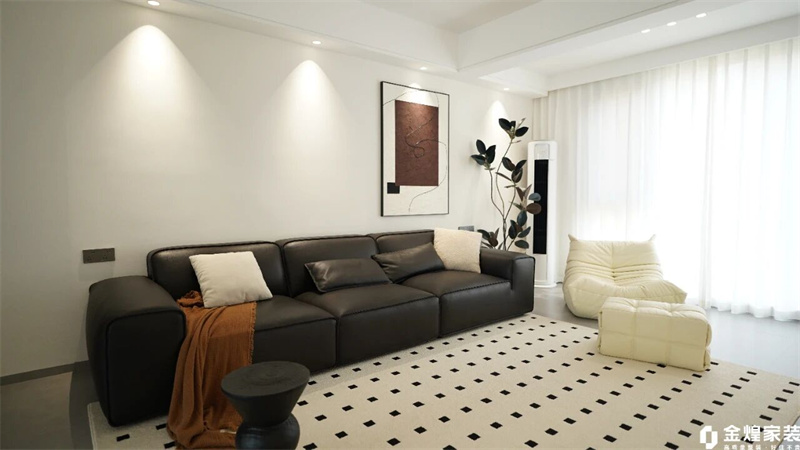 客廳主色調采用白色墻面與灰色大理石地磚搭配,創造出通透明亮的空間感。以低調的深色調沙發展現簡約品味,通過一些精致的極簡設計裝飾畫和空間擺件,為整個客廳注入一絲藝術氛圍。