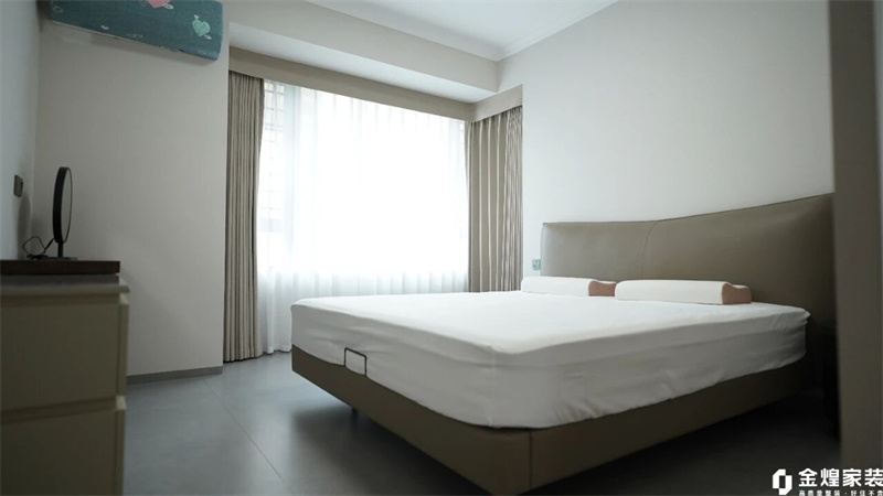 主臥采用了極簡的設計語言,白色墻面搭配灰色地磚,配合大面積的落地窗,營造出寬敞明亮的空間感。簡約風格的皮藝床,搭配質感柔和的床品,營造出寧靜且優雅的休息氛圍。