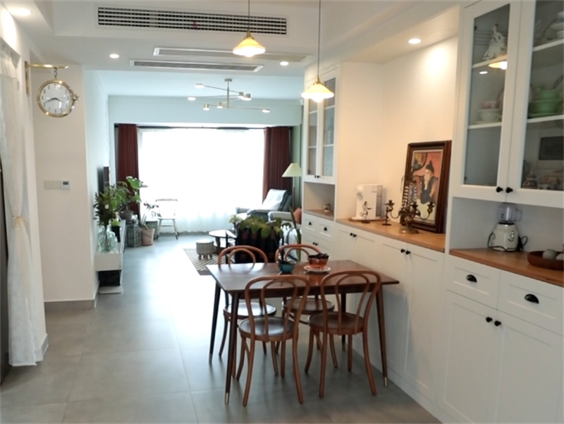 本案客餐廳以灰、白、果綠為主,自然、安靜、舒適,整體硬裝少而精,軟裝+綠植豐富整個空間,讓房子生動起來,像植物園一樣有生機,更讓整個空間鮮活起來。每次回到家都是一次心靈的放松,沙發背景采用一組簡約美觀的裝飾畫,配上清新的綠植,點亮了空間的文藝與清新。