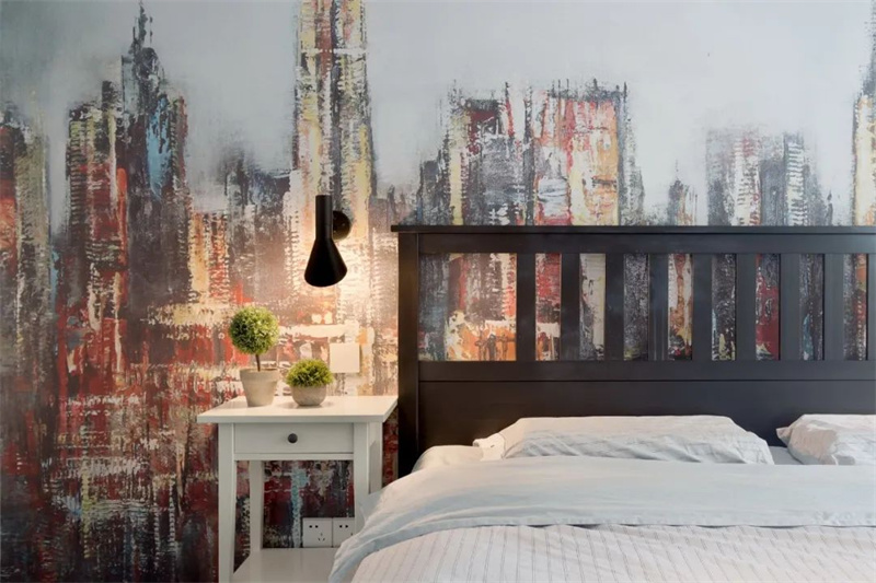 主臥室以白色墻面為主,床頭背景墻繪制大幅藝術畫,為空間增添藝術氣息。大窗戶帶來了足夠的自然光線,使臥室更加明亮。簡約的原木床加上深色地板與白色飄窗臺,簡簡單單的空間,充滿了輕松與自然的質感。