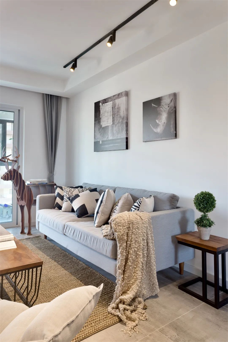 客廳整體采用了白色墻壁,使整個空間更加明亮和開放?;疑卮u增加了室內的深度和溫暖感。家具采用原木色,強調自然元素。舒適的灰色沙發和裝飾枕頭為客廳增添了溫馨感。墻上的裝飾物和藝術品展示著北歐設計的獨特元素,為空間增添了個性。