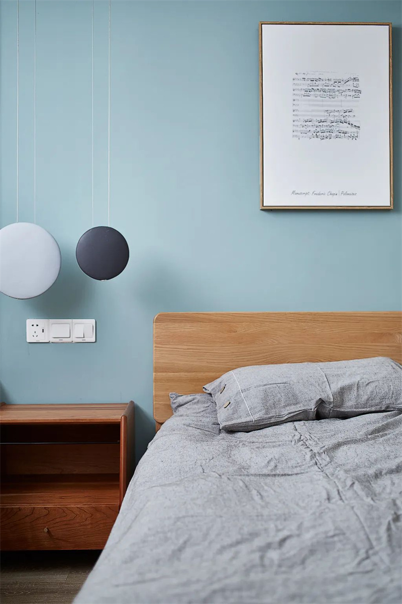 主臥室墻面是明亮的白色,藍(lán)色的床頭背景與灰色的床品組合,加上原木地板和實(shí)木家具,給空間帶來清新的自然感。主臥室的照明設(shè)計(jì)考慮到了夜間舒適的用光需求,包括床頭臺燈和壁燈,打造完美的休憩空間。